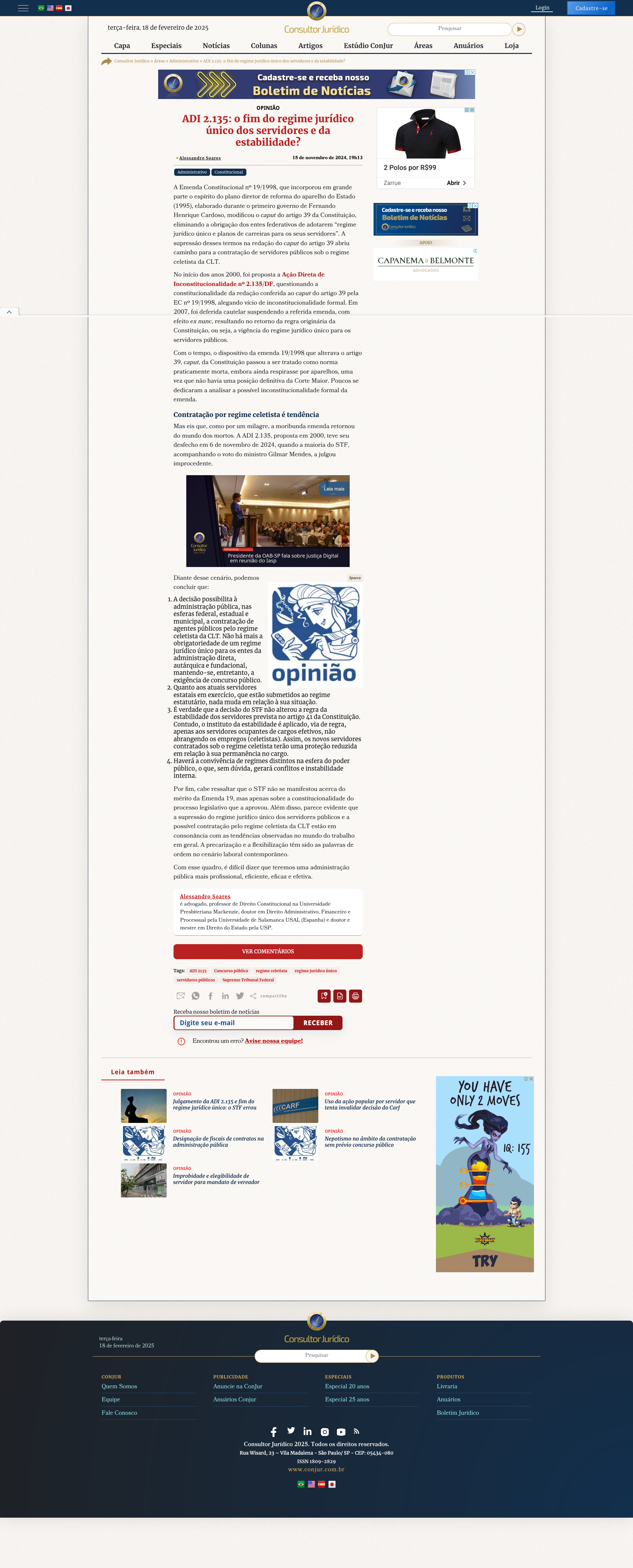Impeachtment de ministros do STF05/02/2025Imunidade parlamentar05/02/2025 ADI 2.135: o fim do regime jurídico 05/02/2025 Categorias Destaques da Mídia Tags Conjur 15/11/2024 Link: https://www.conjur.com.br/2024-nov-15/adi-2-135-o-fim-do-regime-juridico-unico-dos-servidores-e-da-estabilidade/ Compartilhar Artigos Relacionados05/02/2025Imunidade parlamentarLeia Mais05/02/2025Impeachtment de ministros do STFLeia Mais05/02/2025O concurso interno e os estabilizadosLeia Mais