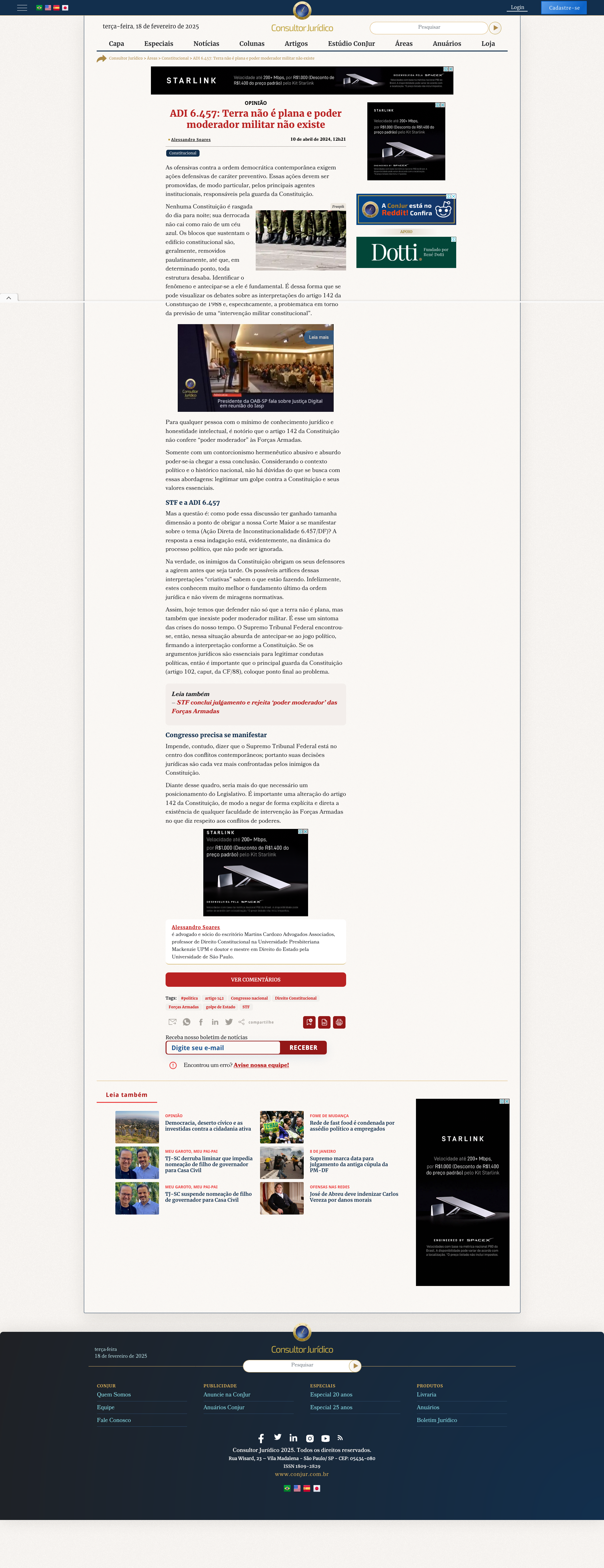Demissão em PAD: cabe recurso hierárquico ao presidente da República?05/02/2025Reforma constitucional e participação popular no Brasil e Espanha: análise comparada05/02/2025 ADI 6.457: Terra não é plana e poder moderador militar não existe 05/02/2025 Categorias Destaques da Mídia Tags Conjur 10/04/2024 Link: https://www.conjur.com.br/2024-abr-10/adi-6-457-terra-nao-e-plana-e-poder-moderador-militar-nao-existe/ Compartilhar Artigos Relacionados05/02/2025Imunidade parlamentarLeia Mais05/02/2025ADI 2.135: o fim do regime jurídicoLeia Mais05/02/2025Impeachtment de ministros do STFLeia Mais